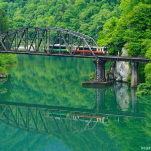 第八橋梁は只見川を横断する橋ではなく、左岸をタテに渡る変わった橋。川面が波立ってしまって水鏡が撮れないのは運が足りなかったですが、輝く新緑をバックにしてこの時の光線の加減は悪くないですよね。近くの寄岩橋の上から望遠レンズで撮っていますが、DA50-135mmではテレ端の足の長さがあと一息足りない感じも・・・まあ贅沢は言いますまい。